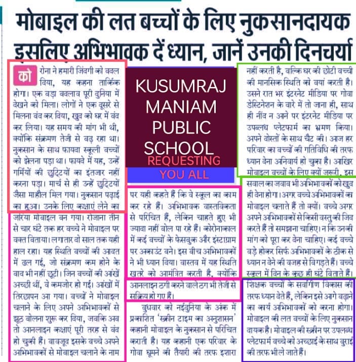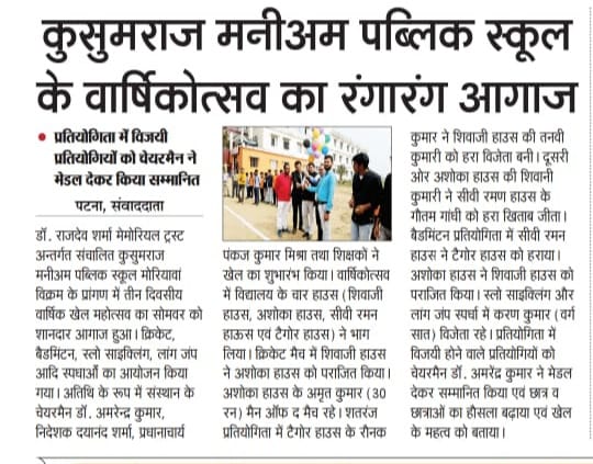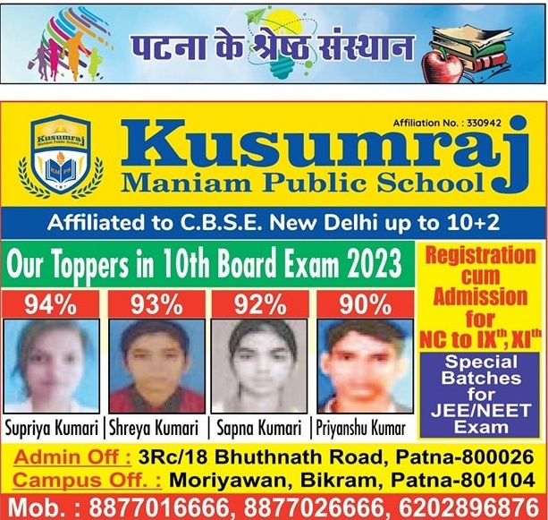 KUSUMRAJ MANIAM PUBLIC SCHOOL is a unit of Dr. Rajdeo Sharma Memorial Trust.Kusumraj Maniam Public School is situated near Moriyawan,P.O Datiyana, P.S. Bikram. The school is established for the development of that region and society. It follows co-education with residential and day-boarding pattern.